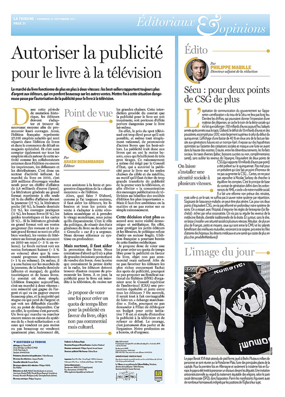 Je propose donc de voter une loi pour créer un quota de temps libre pour la publicité en faveur du livre, objet non pas commercial mais culturel. Afin de ne pas favoriser les éditeurs les plus riches concernant l’achat des spots de publicité, pourquoi ne pas proposer au Syndicat national de l’édition (SNE) d’organiser avec le Conseil supérieur de l’audiovisuel (CSA) une promotion équitable et juste entre tous les éditeurs ? De surcroît, il serait tout à fait envisageable de faire un échange marchandise. Enfin, pourquoi ne pas demander à l’Etat de débloquer un budget pour cette initiative ? Il est si simple d’interdire la publicité à la télévision et de refuser ce débat.